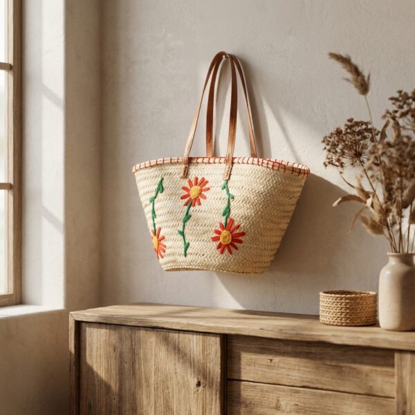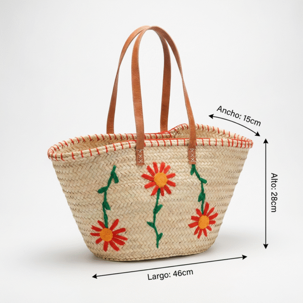 Capazo de Playa Artesanal con Ramillete de Flores y Asas de Piel