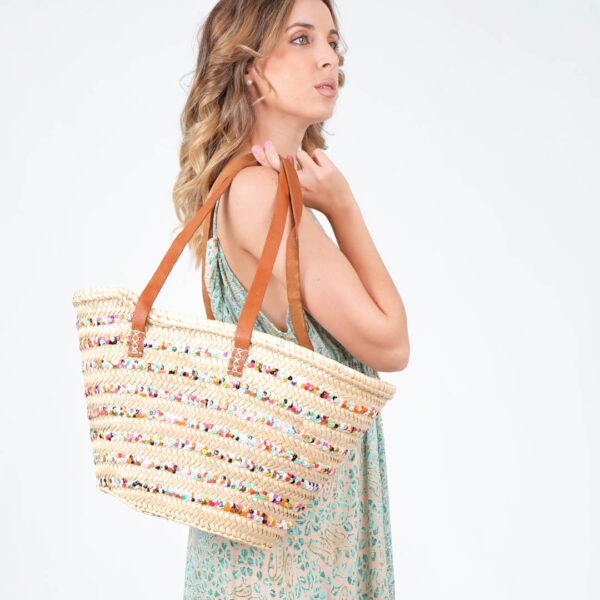 Capazo de Playa con Lentejuelas Multicolor – Asa de Piel