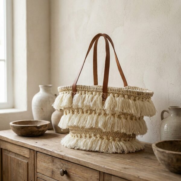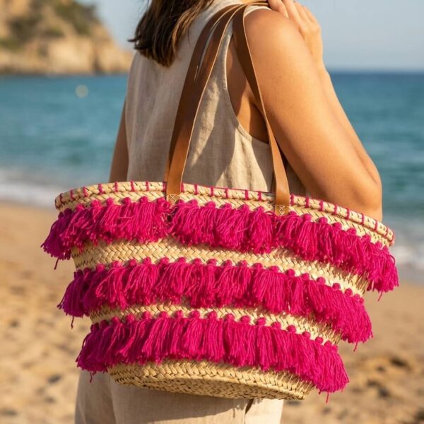 Capazo de Playa Borlas de Hilo – Asa de Piel