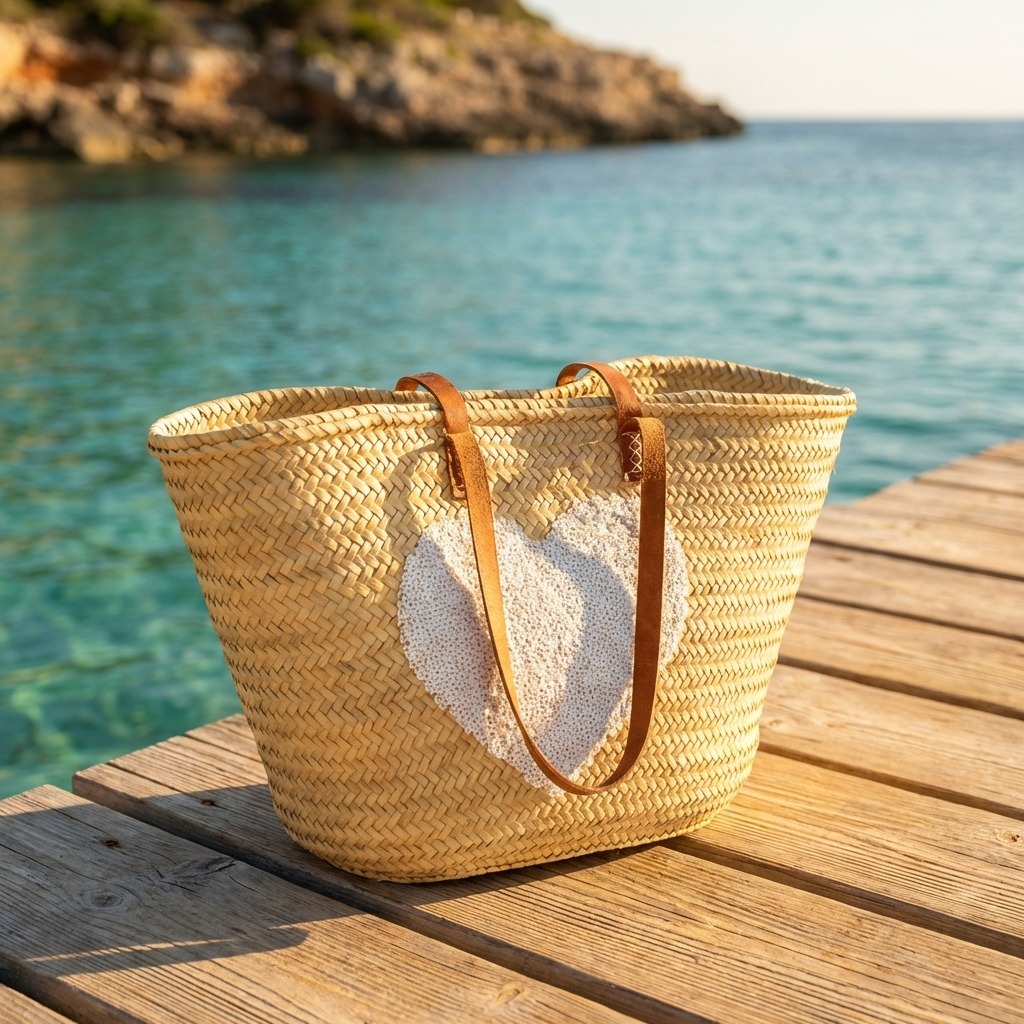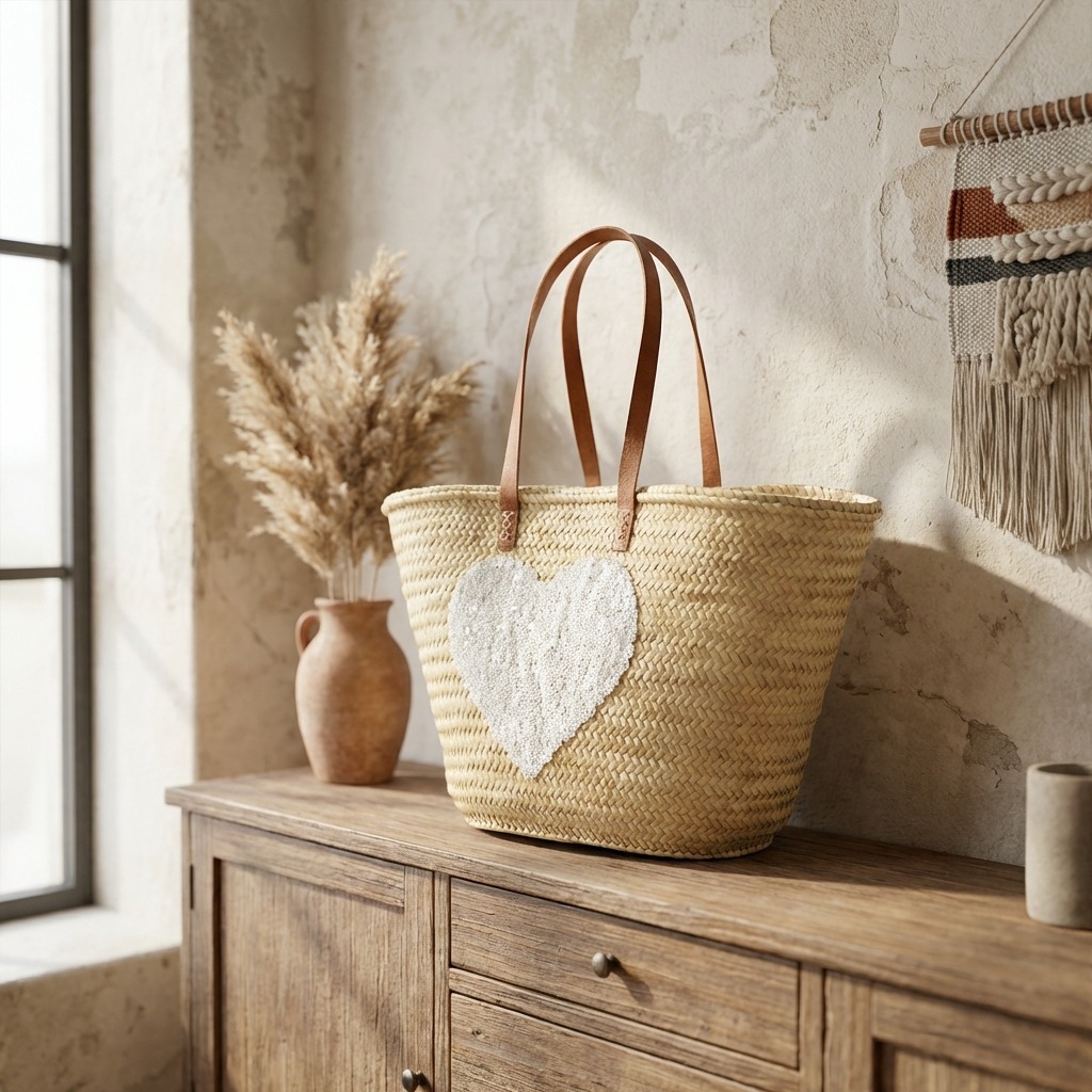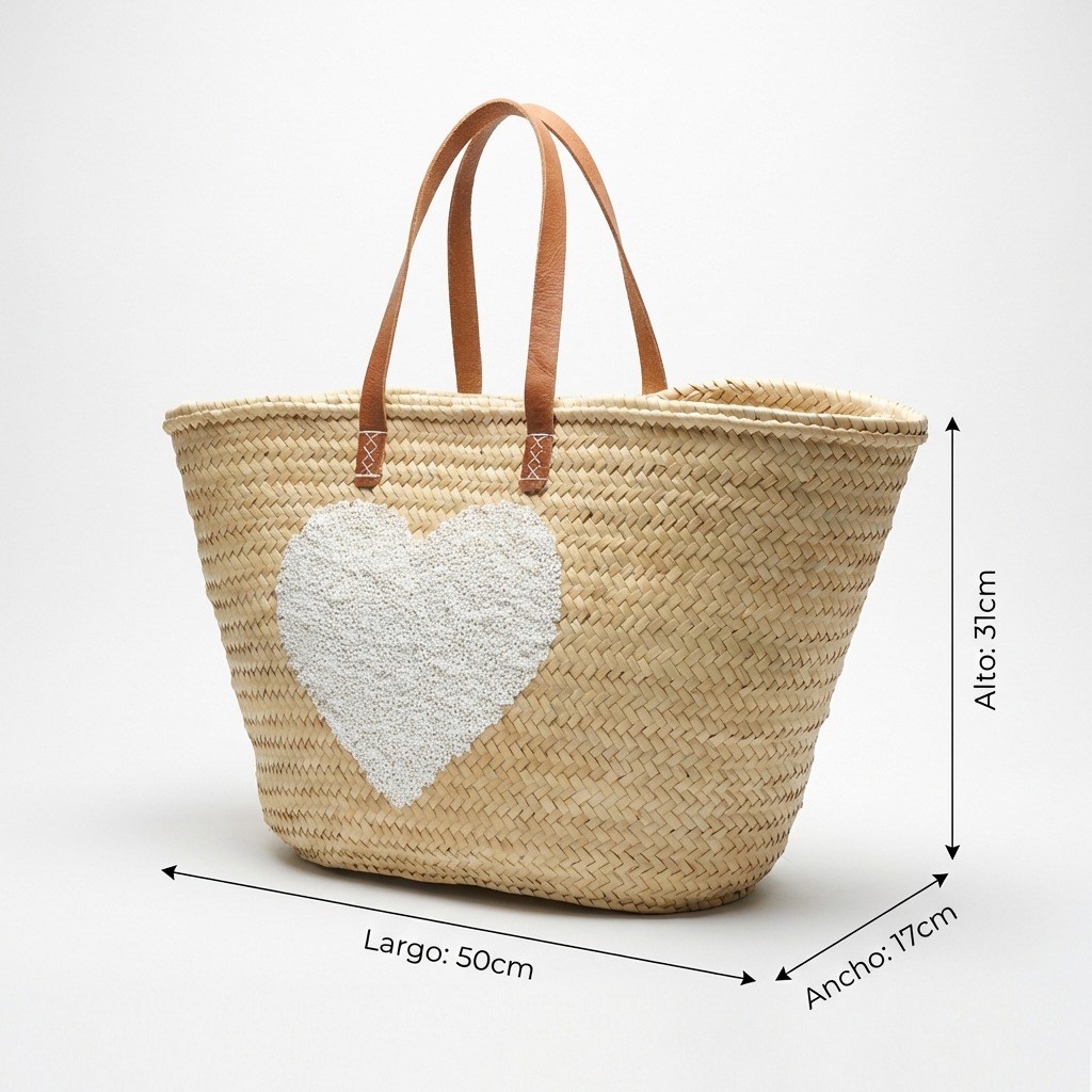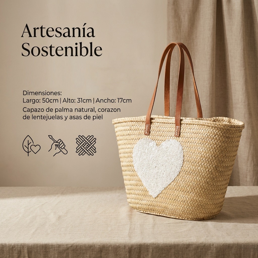Su distintivo corazón de lentejuelas aporta un toque romántico y original que lo convierte en el complemento perfecto para tus looks de verano. Las asas de piel natural garantizan comodidad y durabilidad en cada uso. ✨