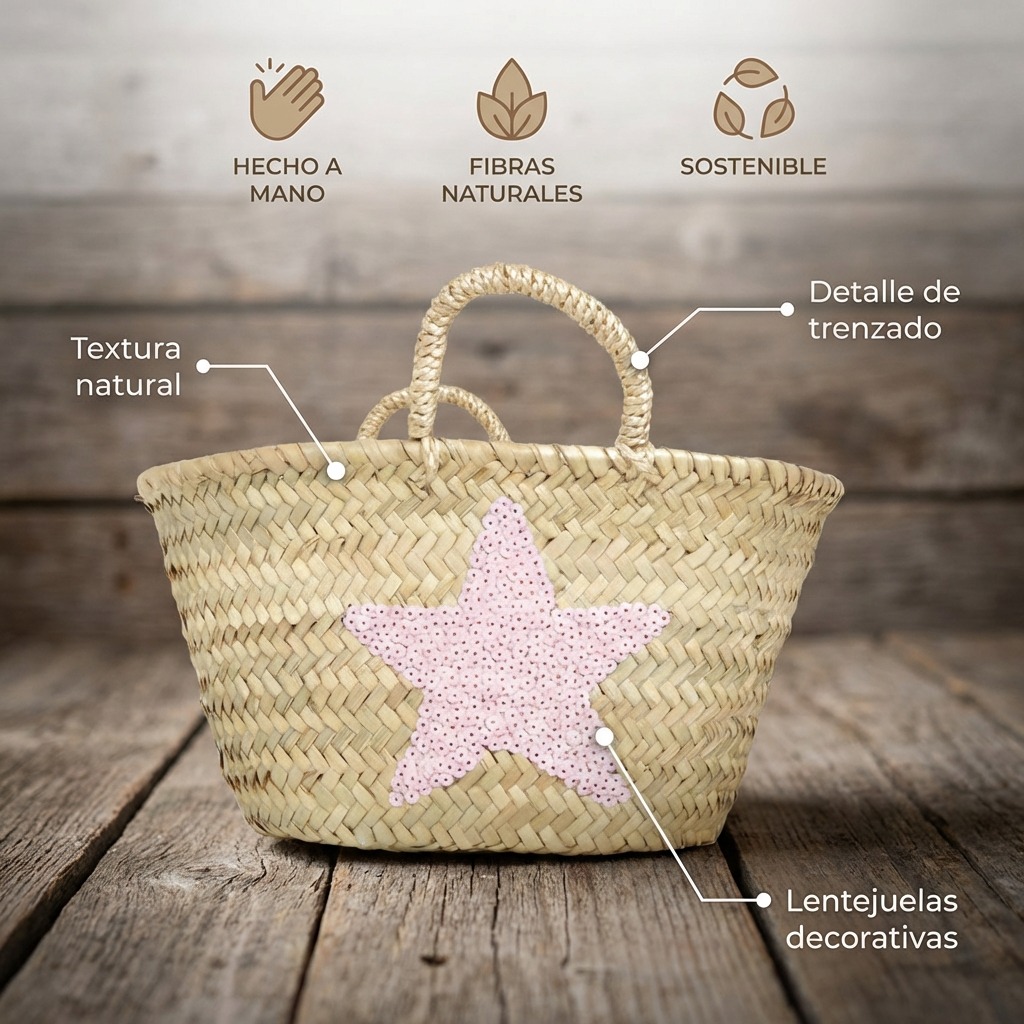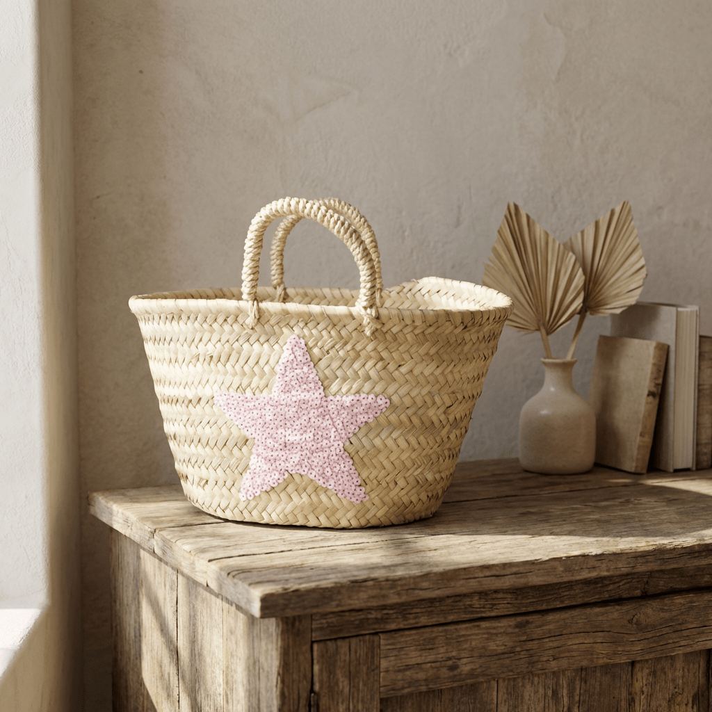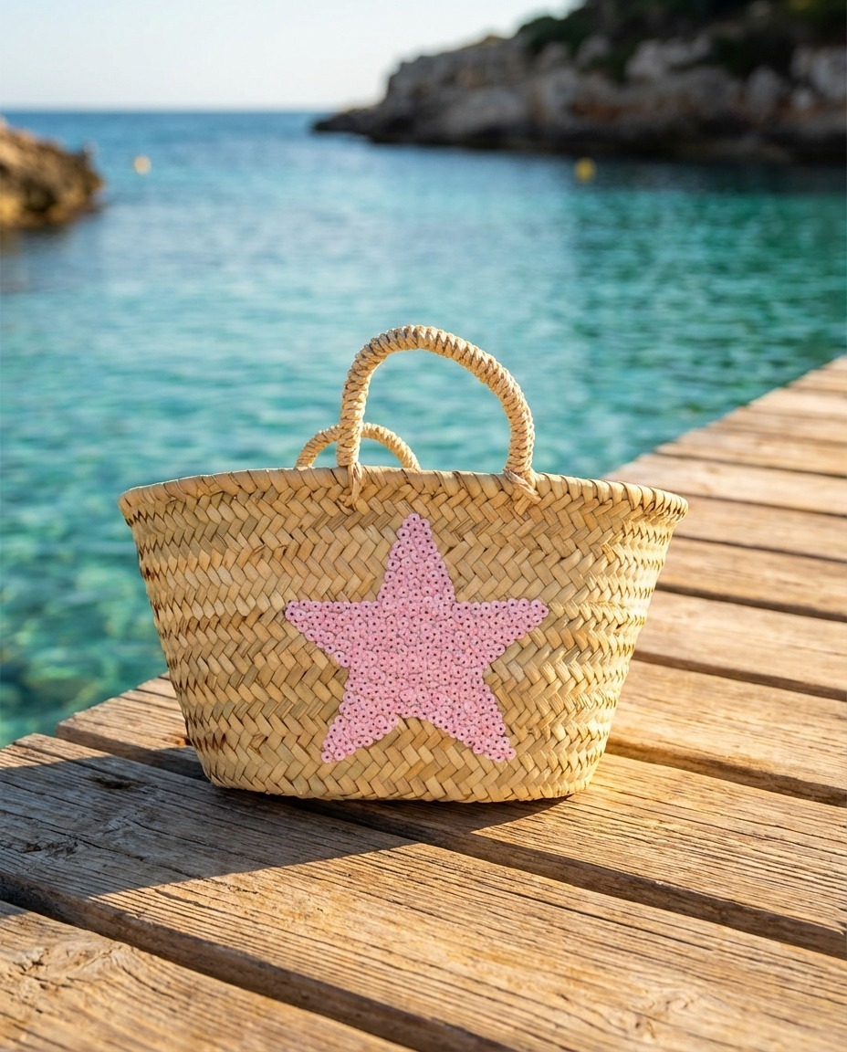 ¡Dale un toque brillante a tus días de sol! Este Capazo de Playa Mediano Estrella es el accesorio perfecto para lucir estilo mientras llevas todo lo que necesitas 🌊 Fabricado de forma artesanal en Marruecos con palma natural, cada pieza es única y especial. Su preciosa estrella de lentejuelas lo convierte en el complemento ideal para tus looks playeros ✨ Tamaño práctico y manejable para escapadas a la playa o paseos de verano. Al ser artesano, pueden existir pequeñas variaciones que lo hacen aún más auténtico.